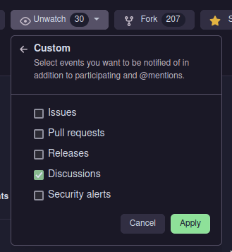To easily follow and subscribe to all future announcements, you can use the "Watch" feature in GitHub with a custom subscription to the "Discussions". This button is in the top right of the repo page, it either says "Watch" or "Unwatch". Then you can click "Custom" in that drop down menu and make sure to check the box for "Discussions".